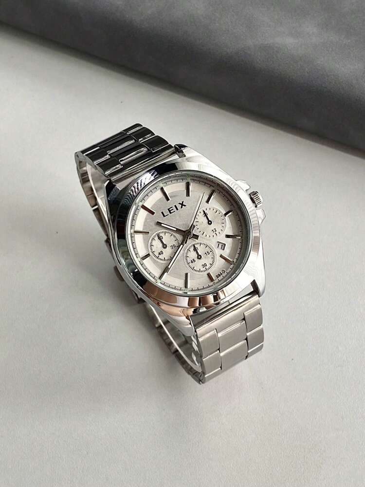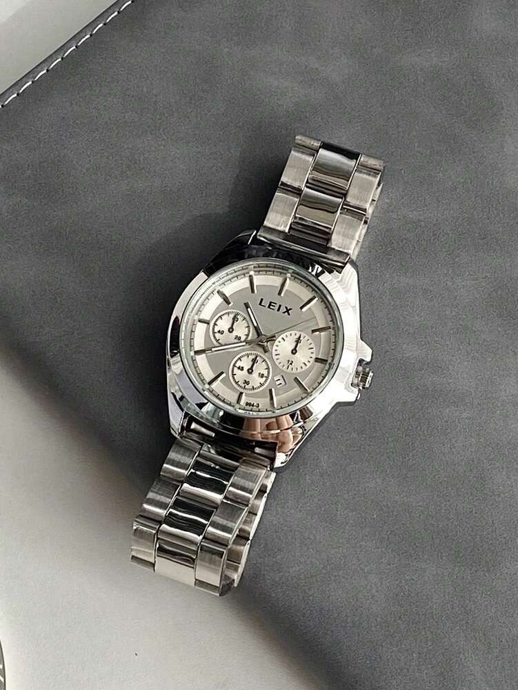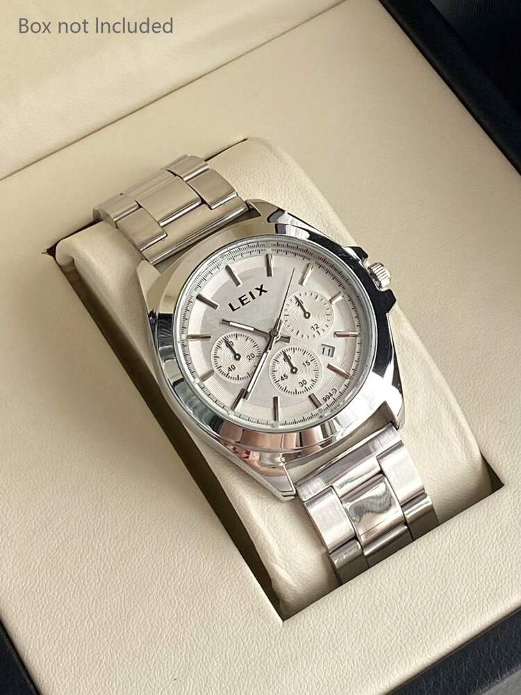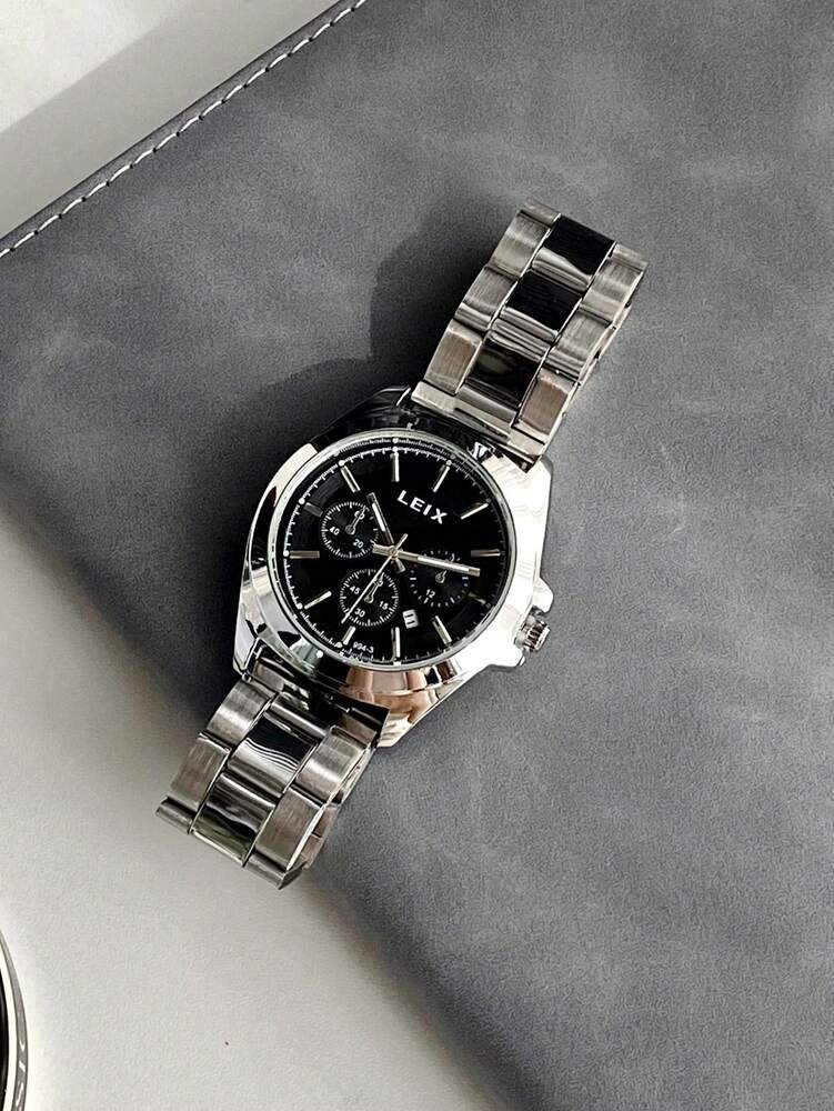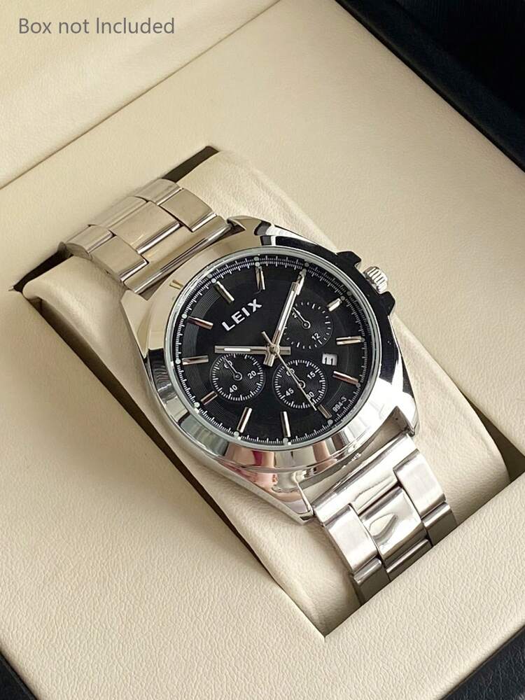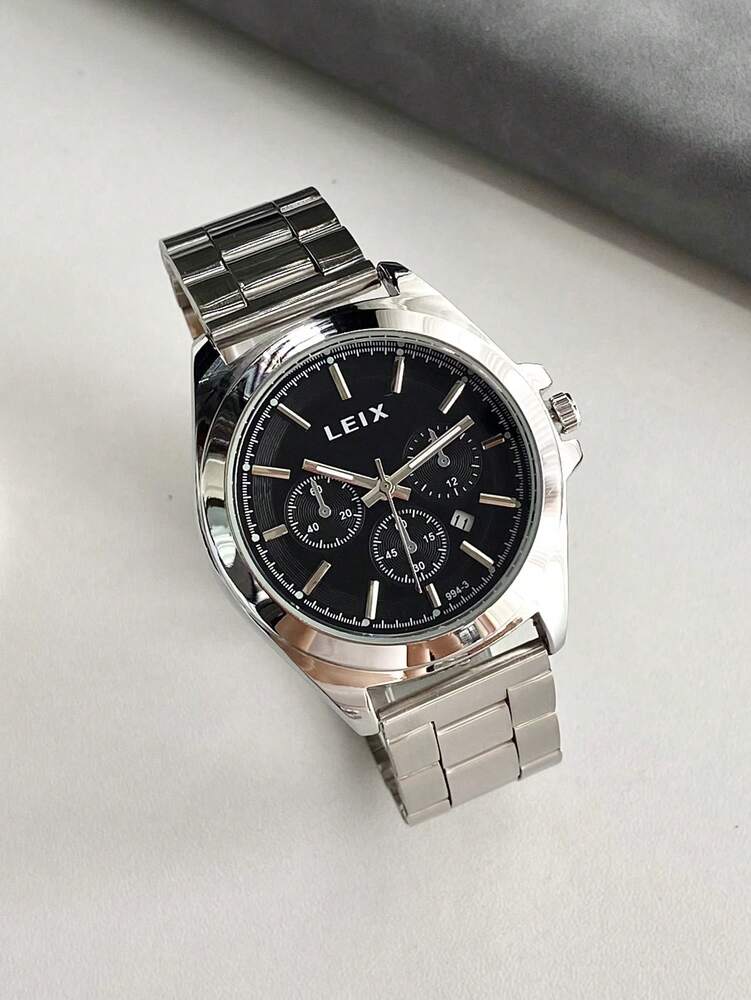 LEIX Men's Business Casual Quartz Watch – Stainless Steel Strap, Black Dial, Calendar Display