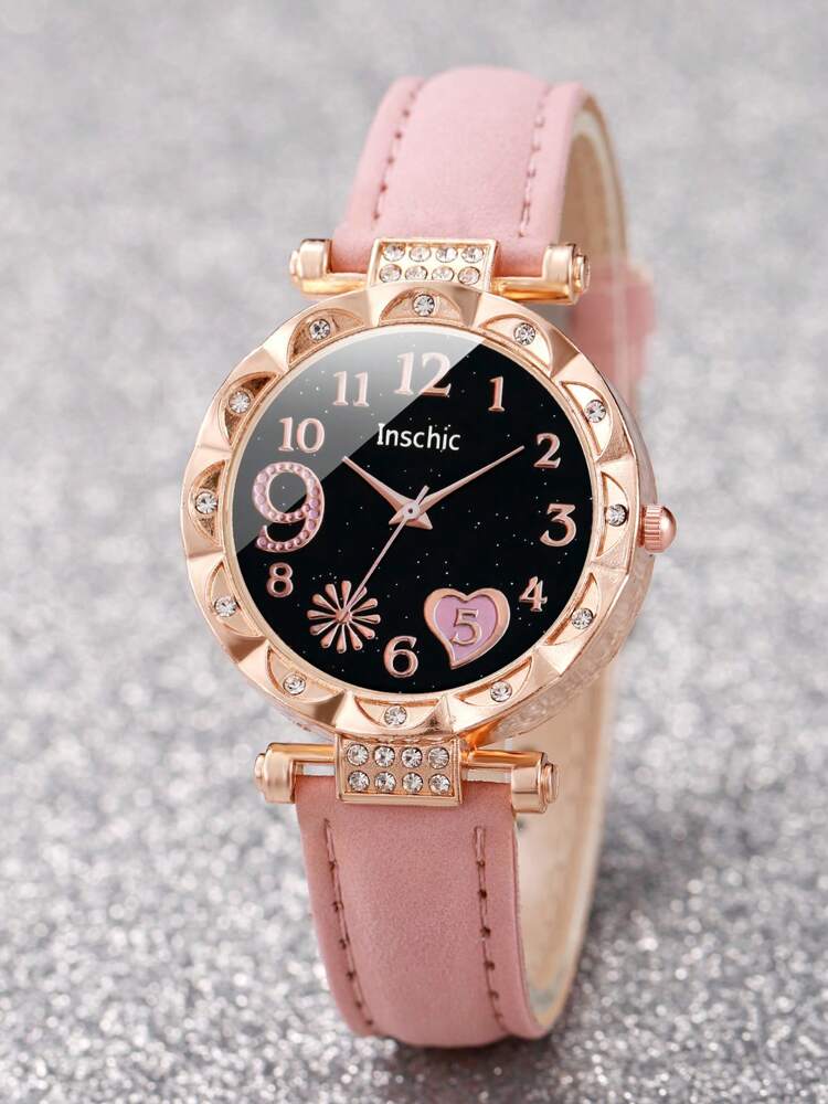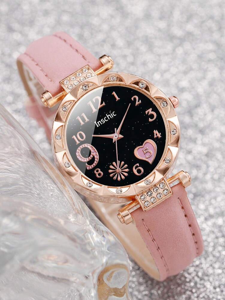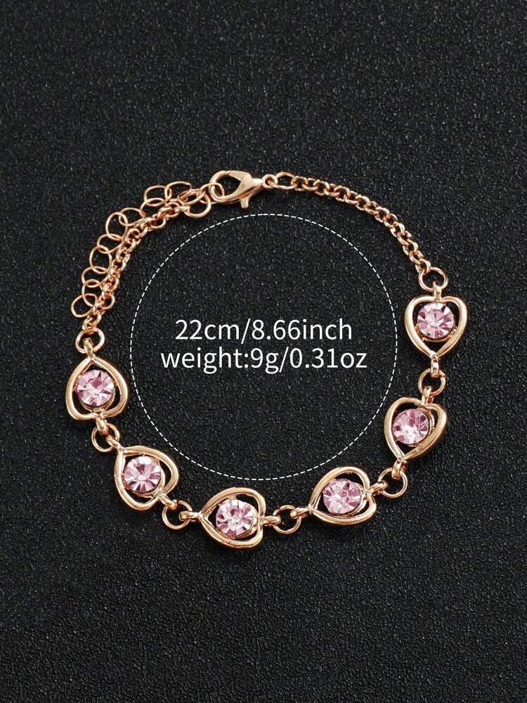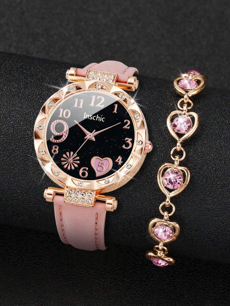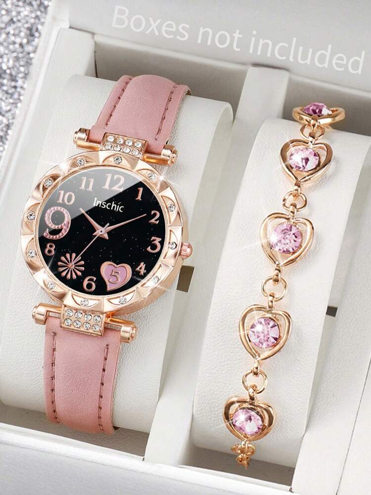Women’s Rhinestone Heart Dial Watch Set – Elegant Pink Strap & Matching Heart Bracelet