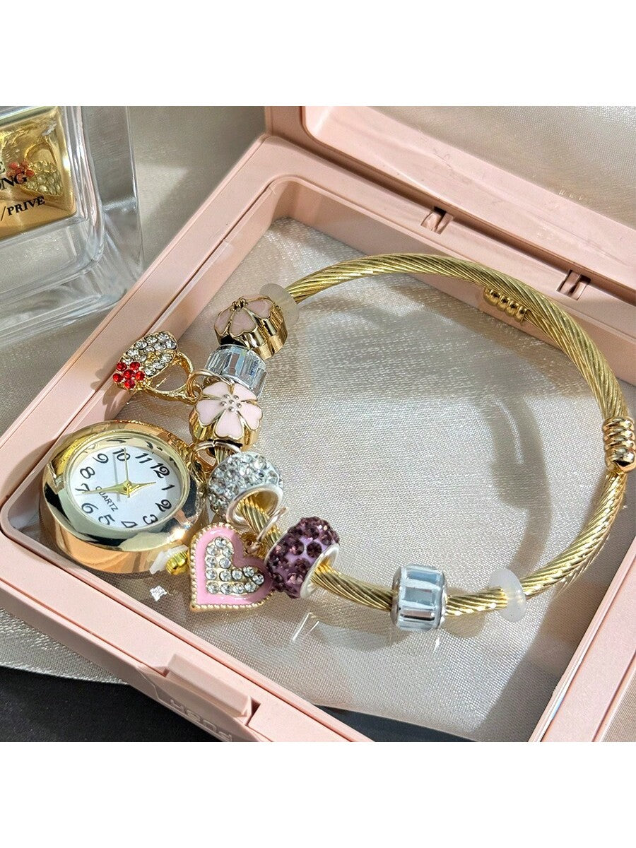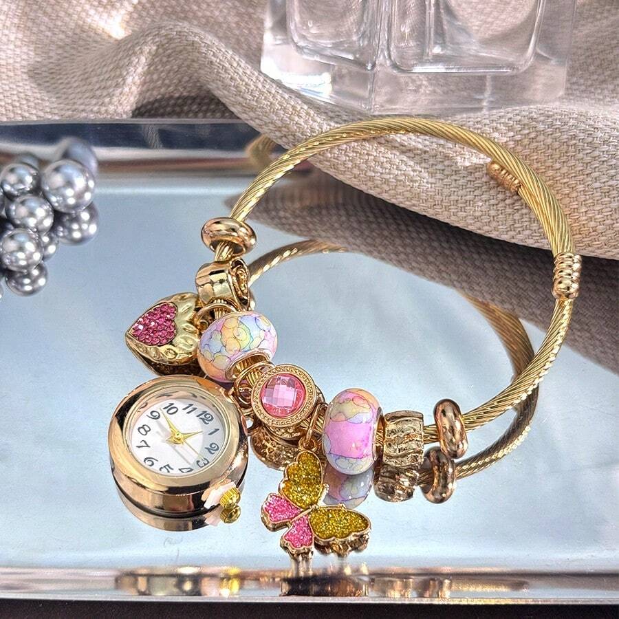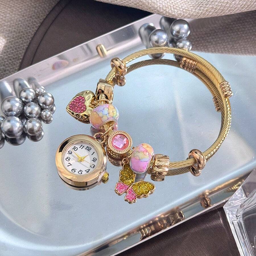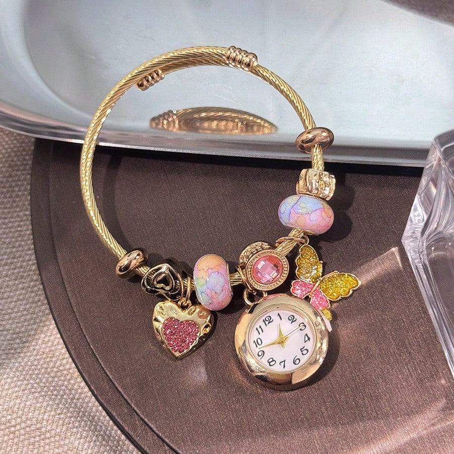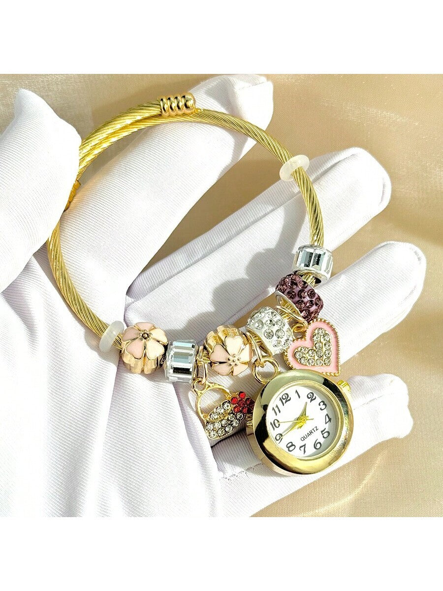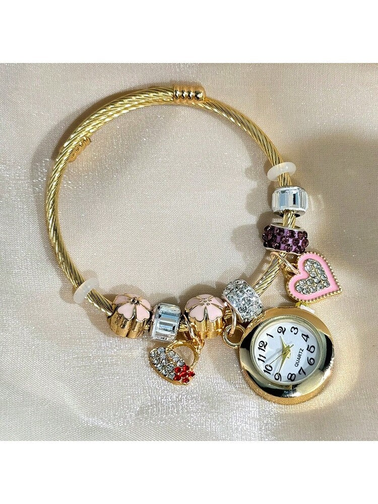 Women's Fashionable Stretch Bracelet Watch with Pink Heart, Floral, Rhinestone & Colorful Beads