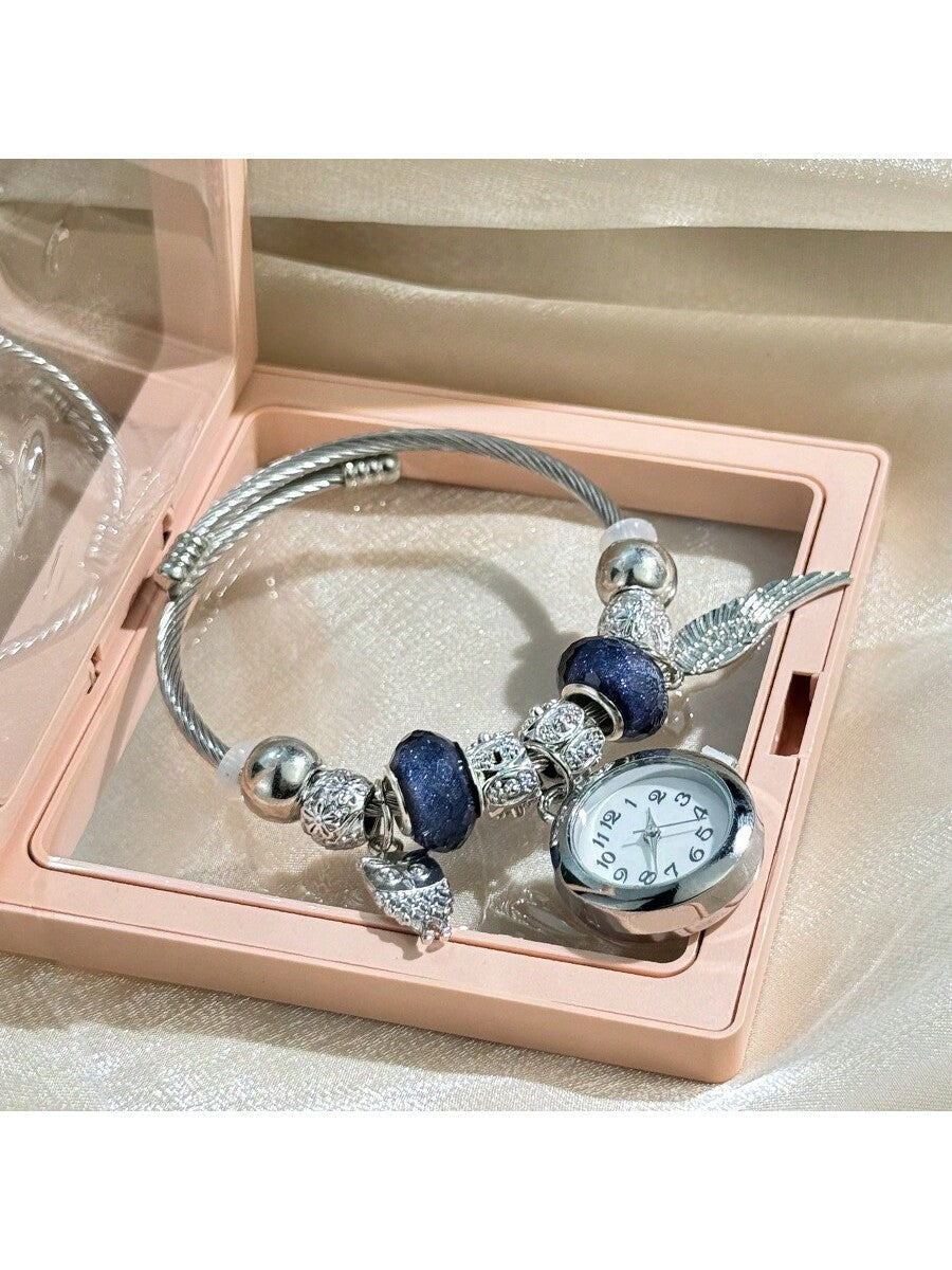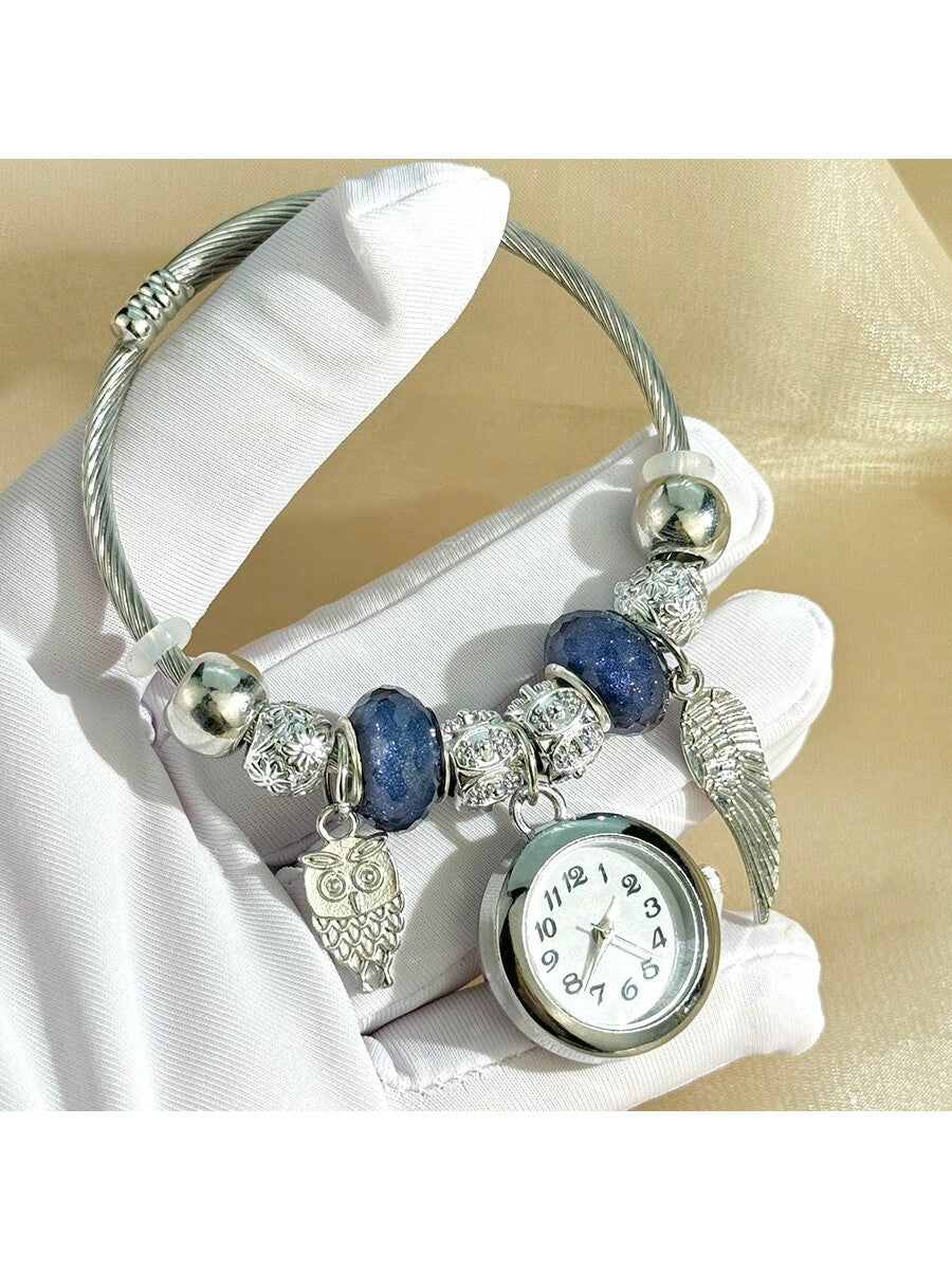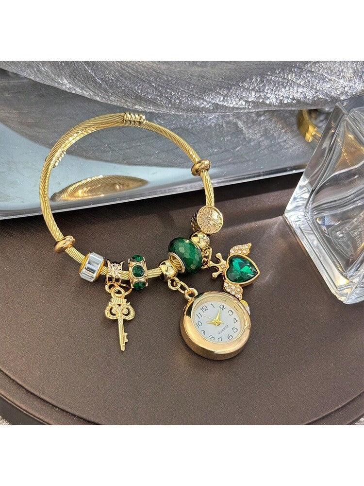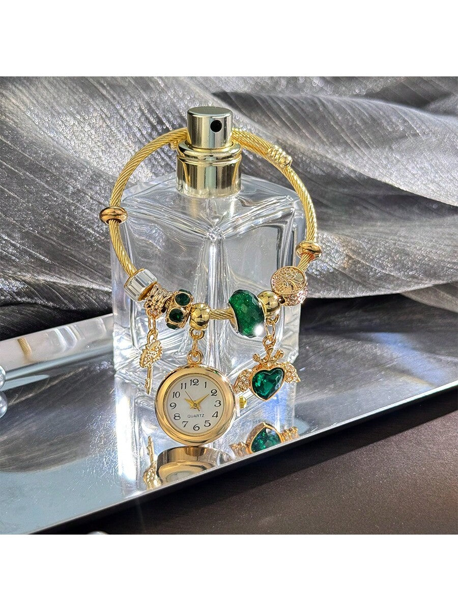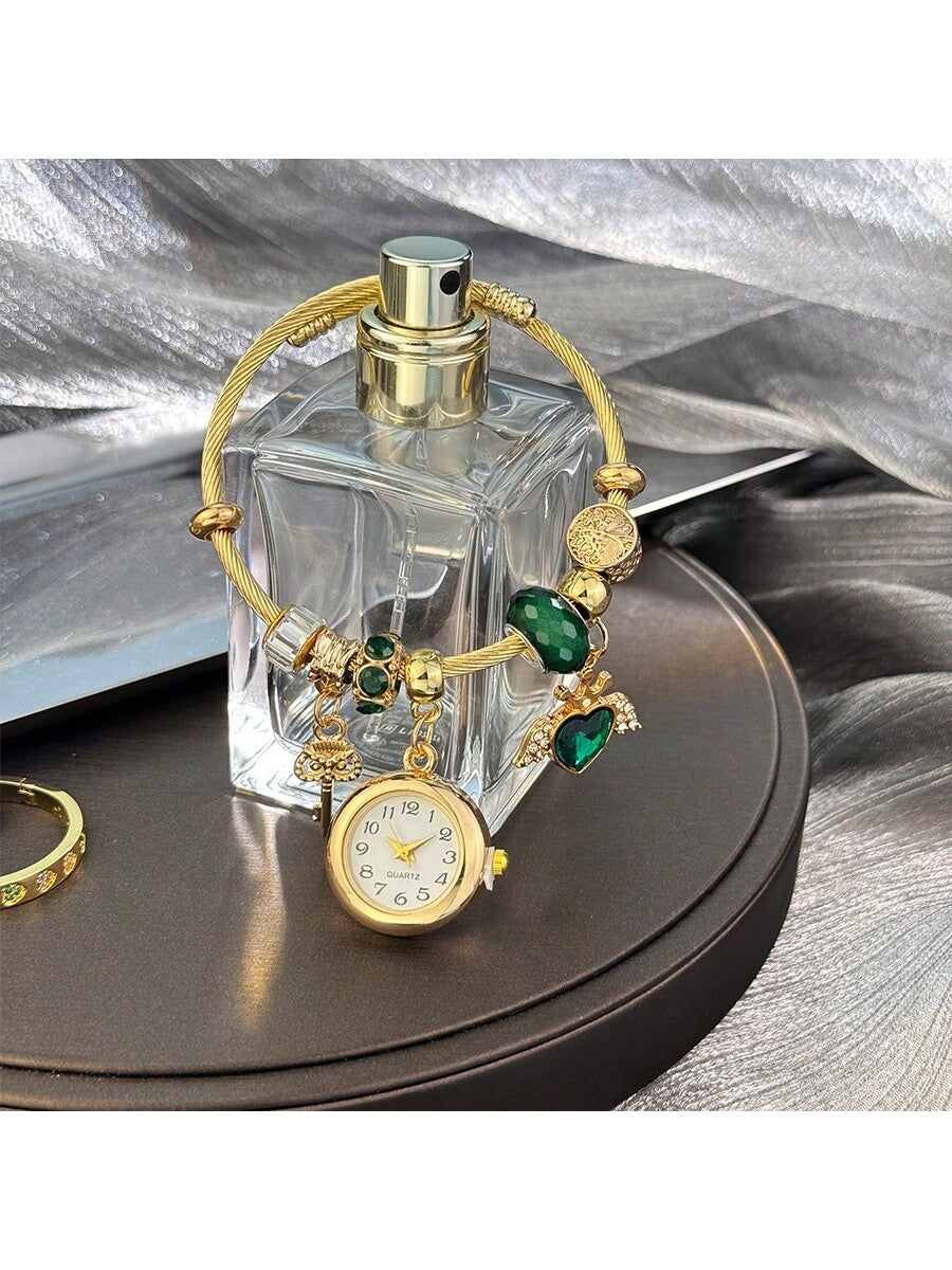 Women's Fashionable Stretch Bracelet Watch with Pink Heart, Floral, Rhinestone & Colorful Beads